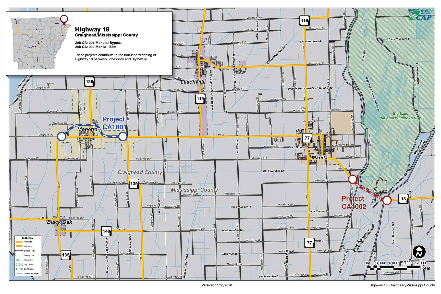 These projects contribute to the four-lane widening of Highway 18 between Jonesboro and Blytheville. When complete, the improvements will enhance the transportation connection between the cities, increase capacity, and improve traveler safety.